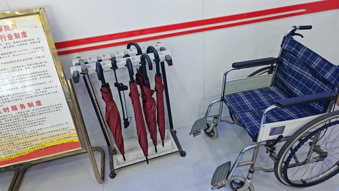 除了“穿新衣”的等候椅,政务大厅里的诸多细节,更让这份温暖直抵人心:在大厅咨询台旁,专门为雨天办事群众准备的雨伞架摆放整齐,方便群众随时取用;墙角的便民服务角内,便民药箱被擦拭得一尘不染,箱内贴心配备了创可贴、碘伏等药品确保群众能安全便捷地应急。