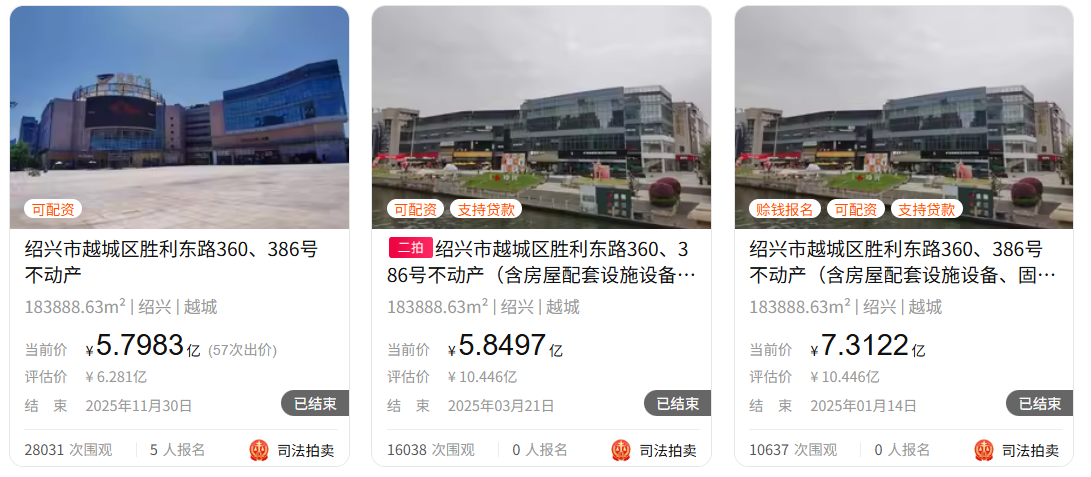 此次拍卖通过阿里资产平台完成。阿里资产平台信息显示,拍卖标的为绍兴市越城区胜利东路360、386号不动产,即绍兴世茂广场,拍品所有人为绍兴世茂投资发展有限公司。拍卖吸引5人报名,28000多人次围观,最终被绍兴众合成企业管理有限公司以5.80亿元的价格收入囊中。