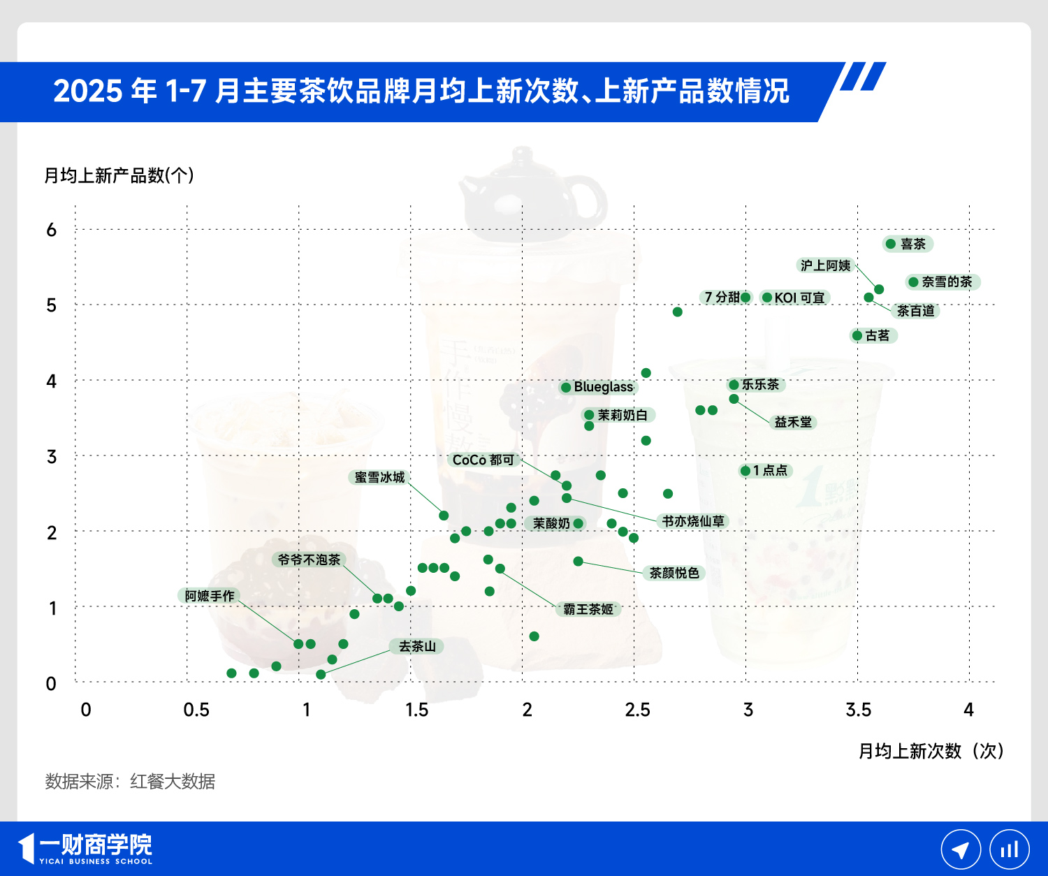 在2025年1-7月这个周期里,茶饮品牌,尤其是头部品牌,向所有人展示了行业巨无霸应有的新品实力。从月均上新次数、新品个数来看,茶饮头部品牌已经卷麻了。奈雪、喜茶、沪上阿姨、茶百道和古茗这些头部品牌就是“又勤又多”的代表,他们都集中在月均上新3-4次、新品5款以上的区间里。这些头部茶饮品牌,向所有人展示了第一梯队的基准线。跨过这条线,就有可能成为行业佼佼者,低于这条线,大概率只能被其他牌子盖过风头。
