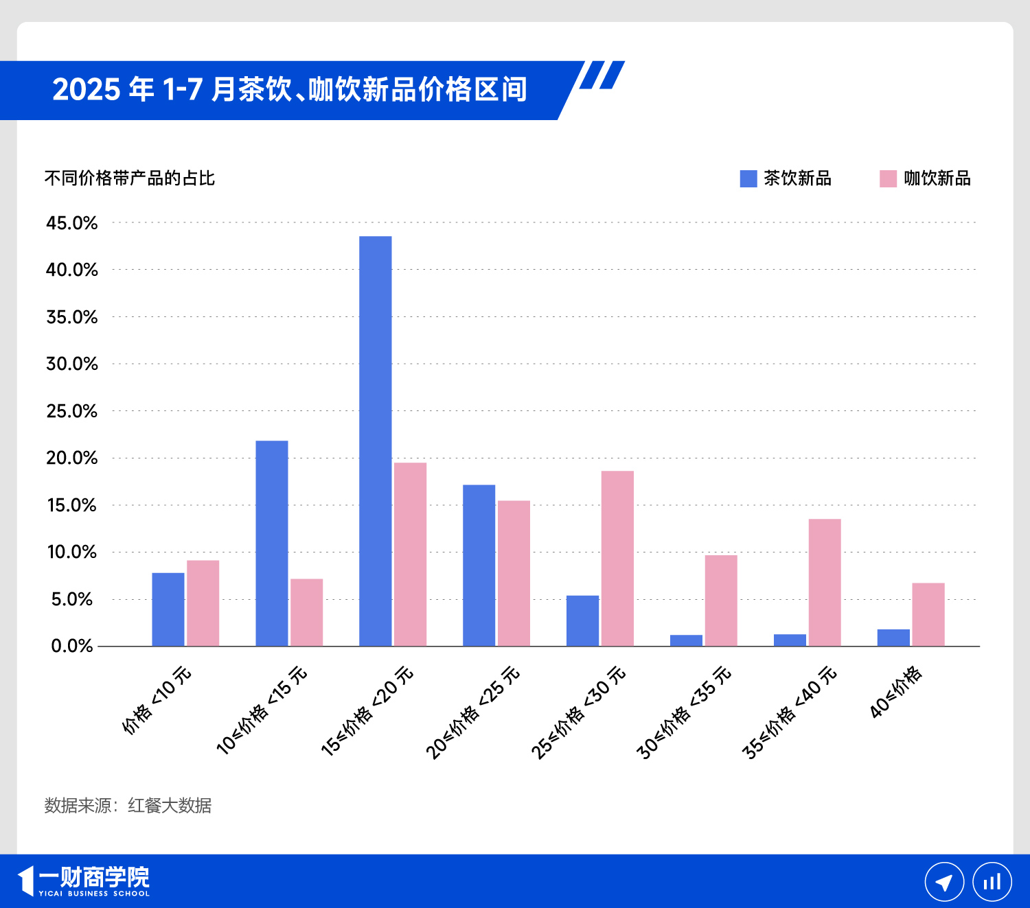 咖饮品牌往往陷入增长困境,大概是因为他们到现在还没形成价格共识。红餐产业研究院数据显示,2025年1-7月,中国市场上的咖饮新品价格带相当模糊。其中,处于15-20元和25-30元价格带的新品比例最高,但也分别只有19.5%和18.6%,其他新品相对平均地分散在各个价格带里。