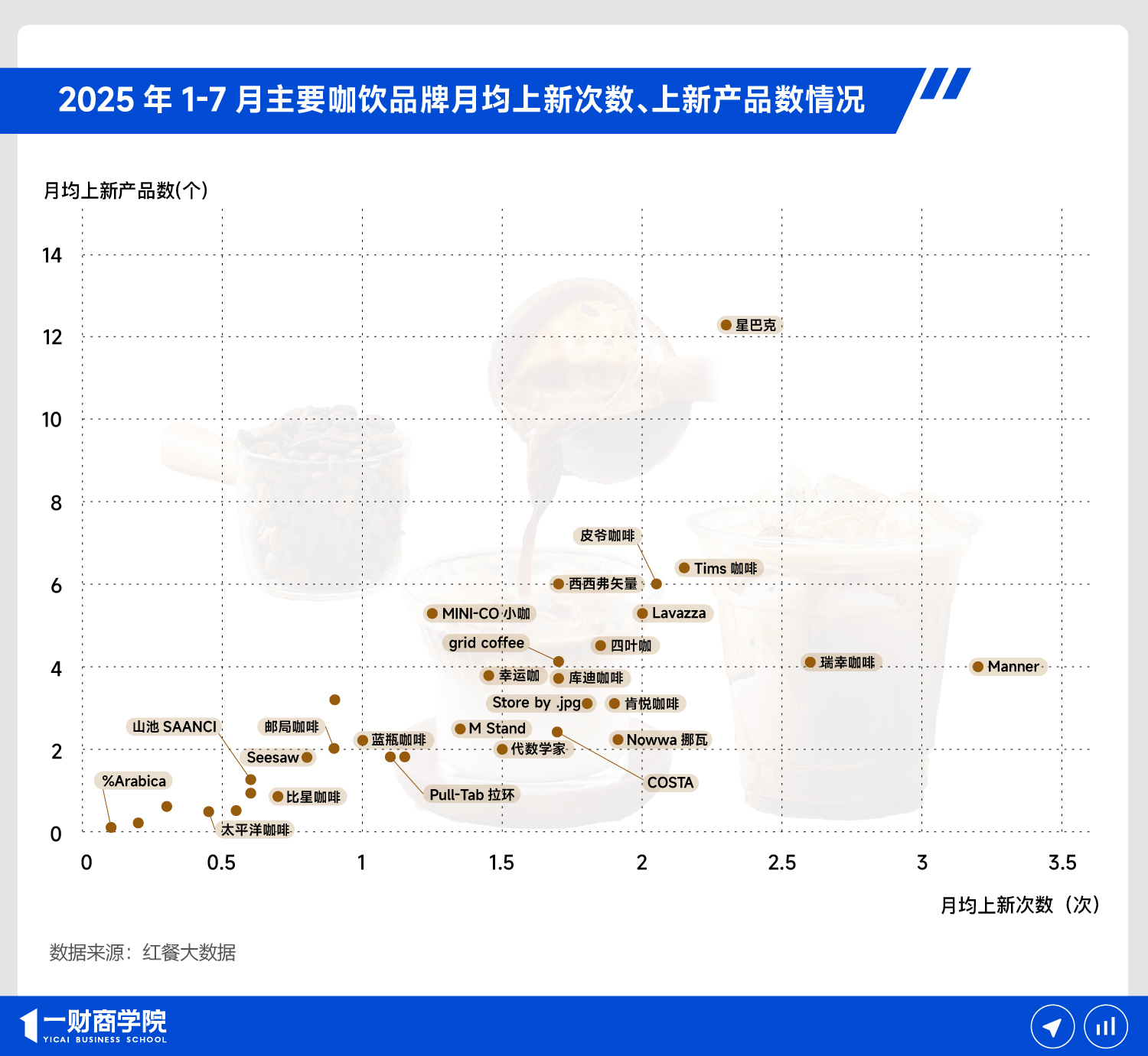 第一阵营是星巴克的独角戏。2025年1-7月,这个咖啡巨头月均上新次数2-3次,月均上新超过12个SKU,让它成了整张图上最特别的异常值。星巴克像哆啦A梦一样不断地从口袋里掏出新玩意,企图留住那些正准备打开Manner和瑞幸小程序的客户,展示出了一种略带恐慌的品海战术。