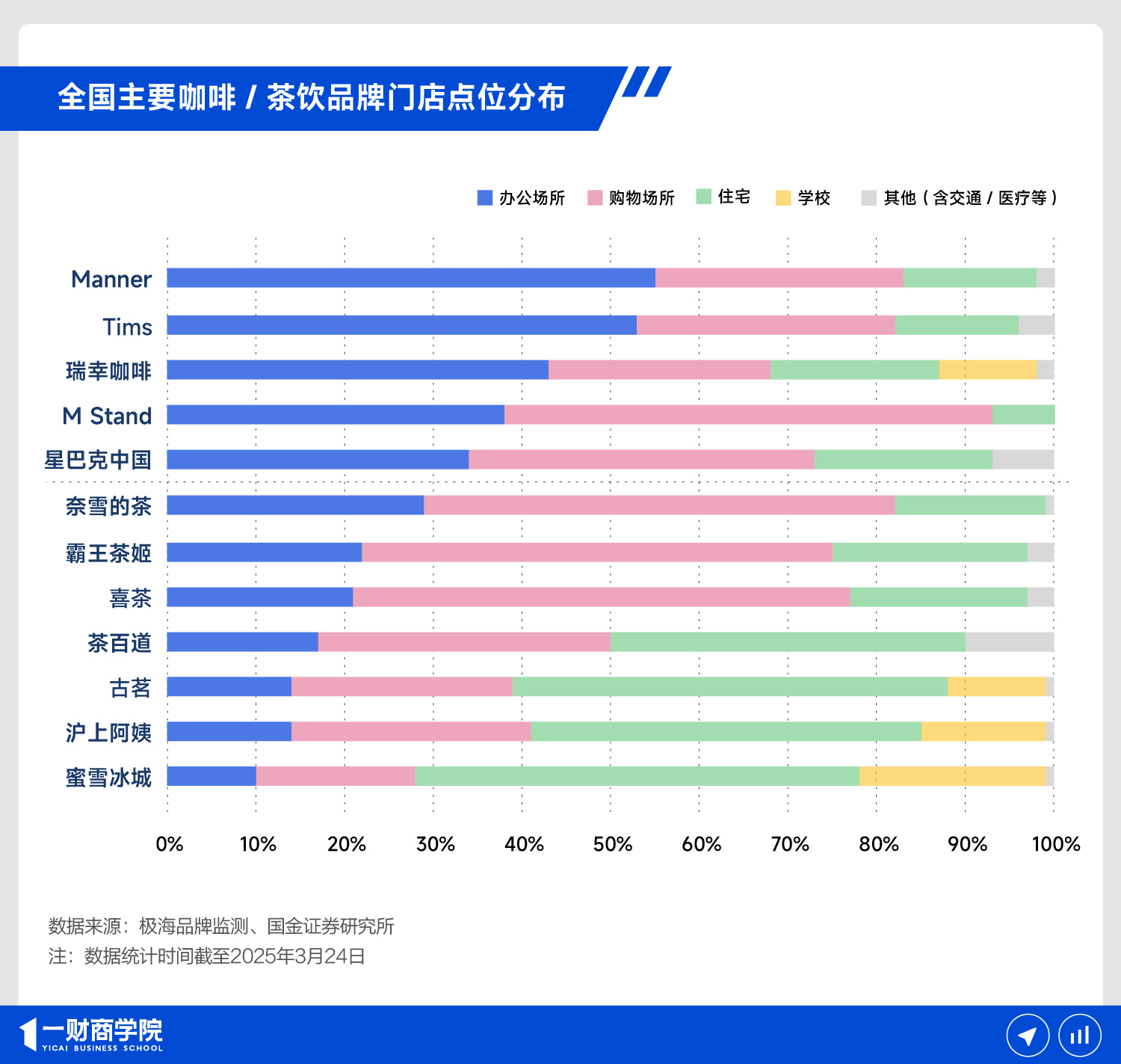 所以当下有74%的咖饮消费发生在办公场所,饮用场景远少于茶饮。人群和场景差异共同直接决定了品牌的选址逻辑。