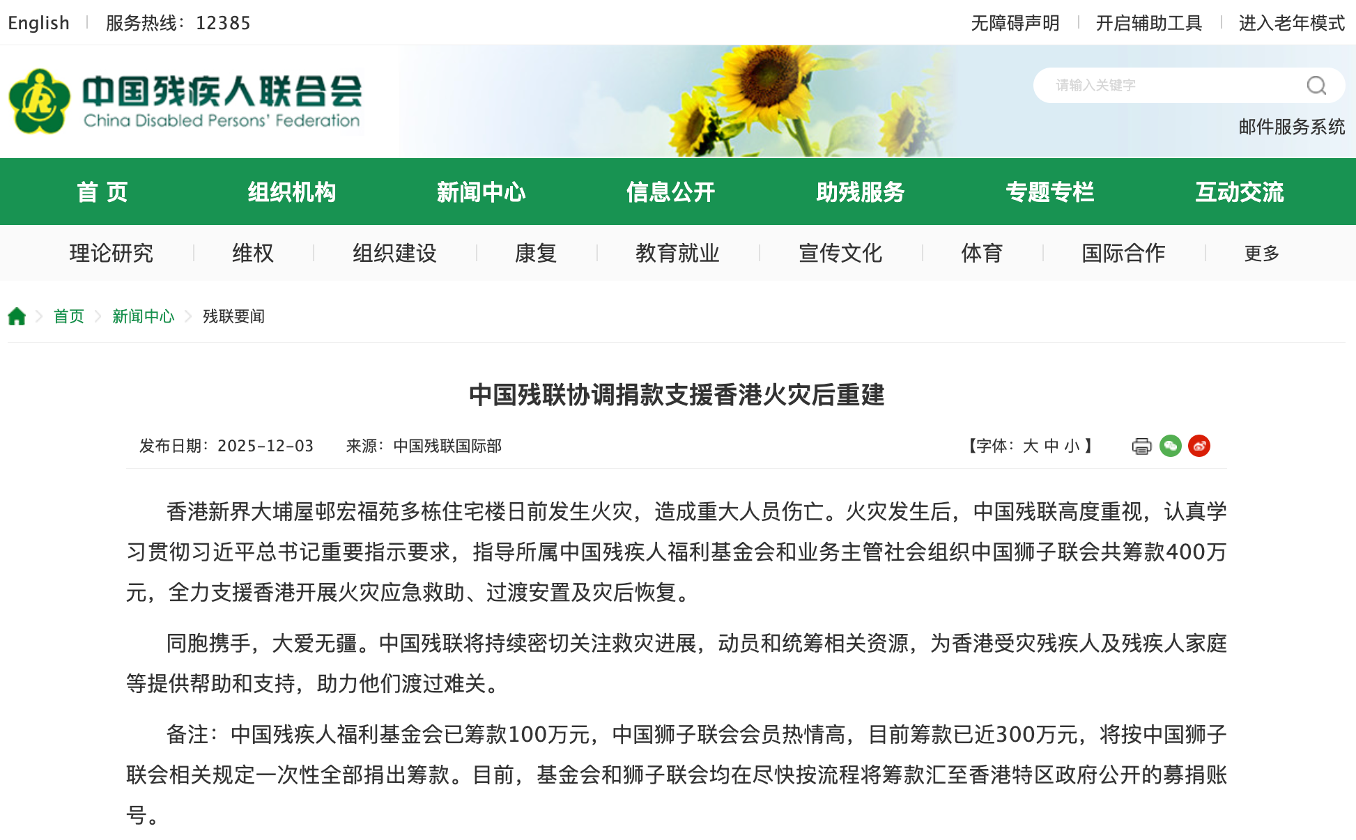 香港新界大埔屋邨宏福苑多栋住宅楼日前发生火灾,造成重大人员伤亡。火灾发生后,中国残联高度重视,认真学习贯彻习近平总书记重要指示要求,指导所属中国残疾人福利基金会和业务主管社会组织中国狮子联会共筹款400万元,全力支援香港开展火灾应急救助、过渡安置及灾后恢复。(中国残联)