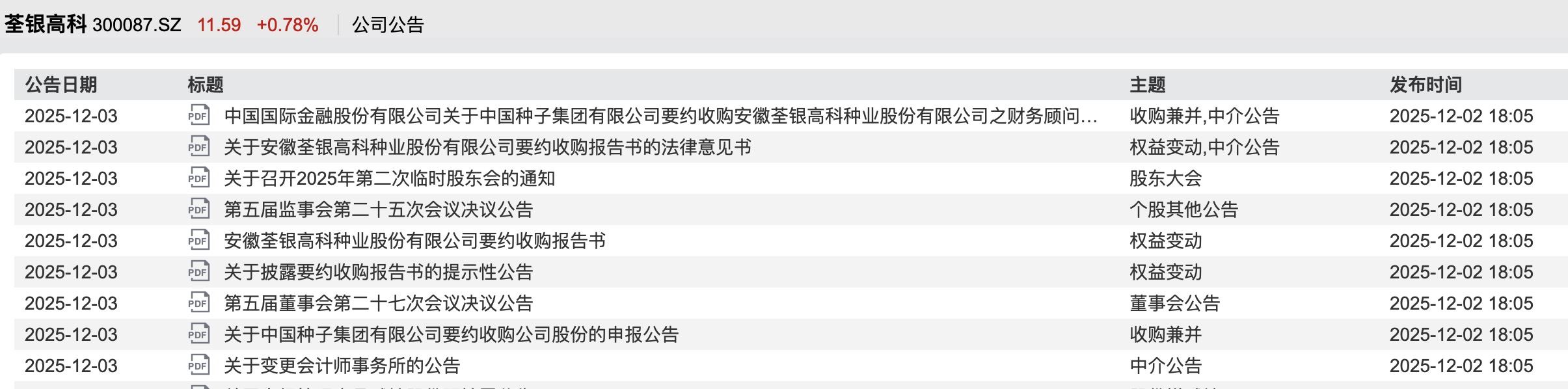 根据公告,本次要约收购的价格定为每股11.85元,预定收购股份数量约为1.89亿股,要约收购总价约为22.45亿元。要约收购期限为2025年12月4日至2026年1月5日。收购股份约占公司已发行股份总数的20.00%,收购完成后,中种集团最多合计持有荃银高科股份比例将增至约40.51%。