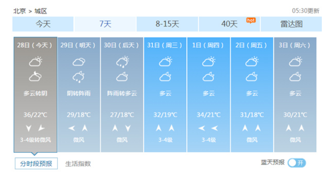 而到了2010年,北京高温日数为15天,2011年为7天,2012年为8天,2013年为10天,2014年为10天。2015年更是仅7月12、13两日的气温就超过了37℃,而这高温一直伴随到15号仍然没有下降的趋势。