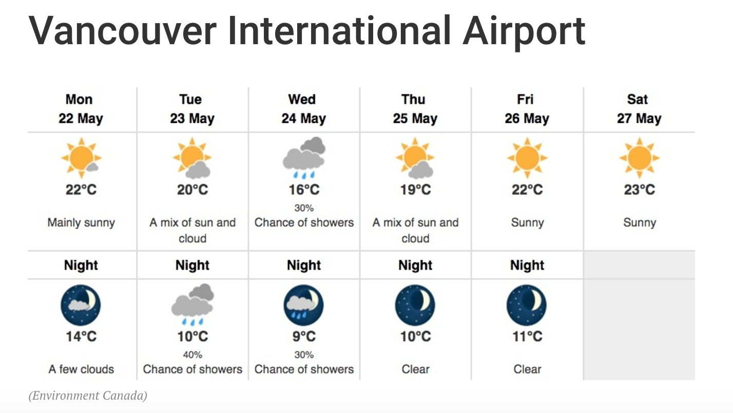 相反,温哥华的高温预警为26度。由于沿海的地理特殊性,往往监测站显示的温度会比内陆地区低2-4度。因此一旦环境部显示的数据达到26度,内陆地区很有可能就逼近30度。但是相比于国内的36度高温设定,显然还是有差距。