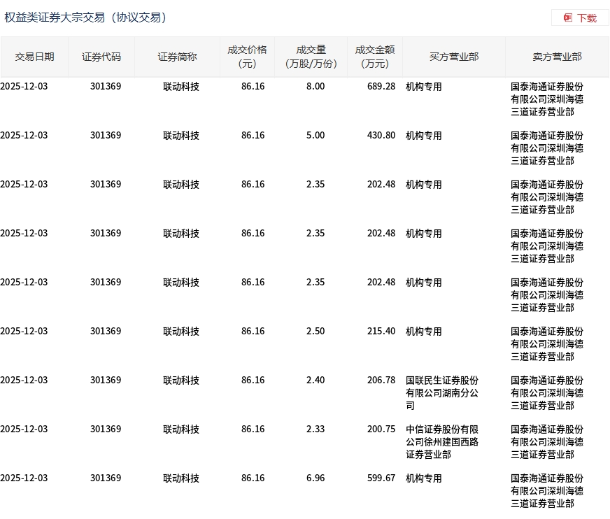 12月3日,联动科技大宗交易成交34.24万股,成交额2950.12万元,占当日总成交额的13.5%,成交价86.16元,较市场收盘价108.64元折价20.69%。