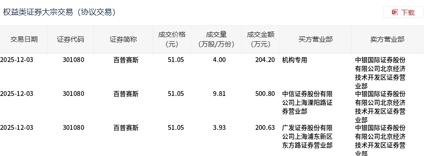 12月3日,百普赛斯大宗交易成交17.74万股,成交额905.63万元,占当日总成交额的11.75%,成交价51.05元,较市场收盘价55.75元折价8.43%。