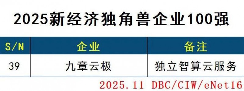 近日,中科院《互联网周刊》联合eNet研究院、德本咨询共同发布了“2025新经济独角兽企业100强”榜单。作为人工智能基础设施及智算云领域的领军企业,九章云极依托自主研发的独立智算云服务,凭借技术创新实力及显著的产业赋能成果成功上榜,成为新质生产力发展浪潮中新经济标杆企业。