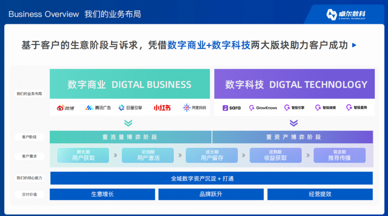 自2018年成立以来,卓尔数科已迅速发展为一家以数字商业与数字科技双轮驱动的营销科技集团。通过两大引擎的协同布局,构建了完整的数字营销科技服务体系: