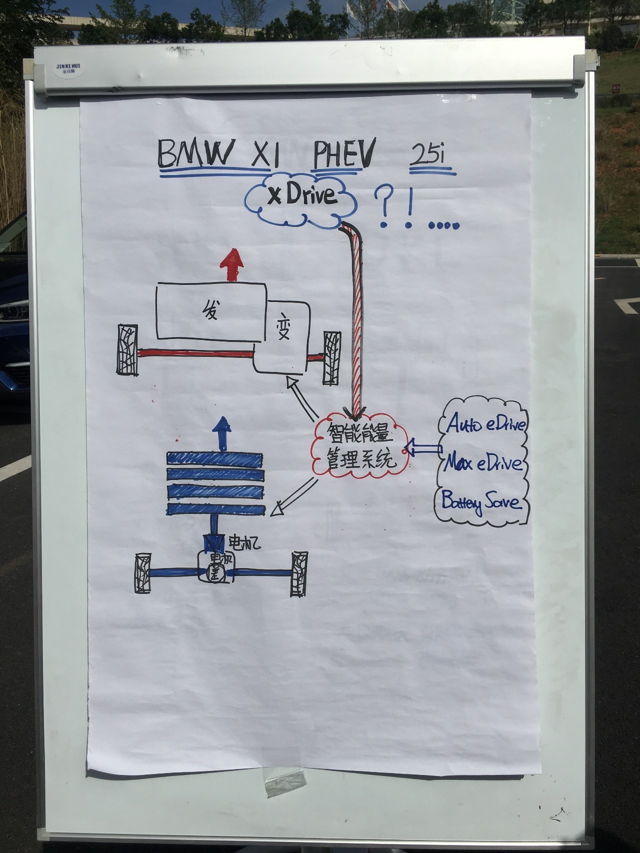 由于最近试驾了多款插电式混合动力车型,因此对于混动车型的结构也有所研究。从结构上讲,宝马X1 xDrive25Le是在1.5T三缸发动机旁边增加了一个被称为“高压起动电机”的装置,实际上是“Belt-Driven Starter-Generator”(BSG皮带传动启动/发电机)实现启动、发电和能量回收。同时,在后轴上增加了一个驱动电机,实现了四驱和纯电驱动的功能。