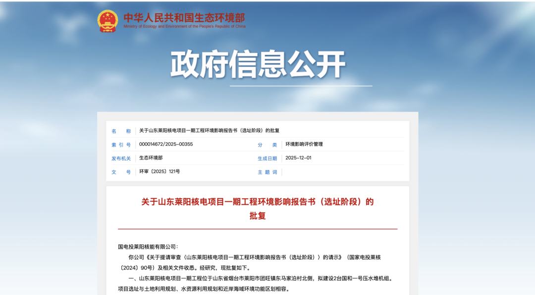 12月1日,生态环境部公布了“关于山东莱阳核电项目一期工程环境影响报告书(选址阶段)的批复”,意味着国家电力投资集团有限公司(下称“国电投”)这一核电项目建设往前推进了一步。
