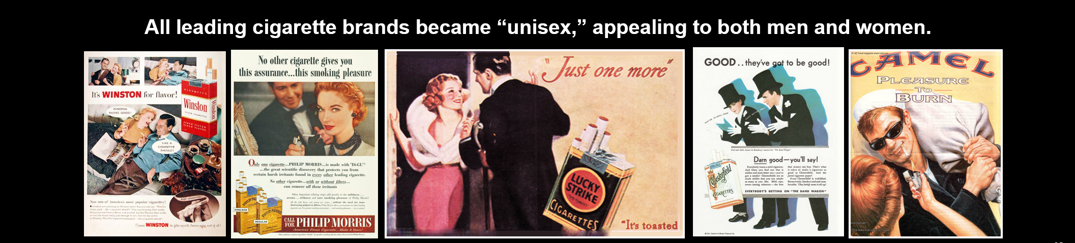 万宝路为什么能够成为一个香烟主导品牌?在1953年问世之前,美国市场上有五大香烟品牌,男性当中有50%是烟民,女性只有20%是烟民。烟草公司也看到了这个调研结果,他们说,其实我们已经覆盖了很多男性烟民,要想增长,就要去关注女性。所以可以看到当时所有香烟品牌的广告都是男性女性同时出现。
