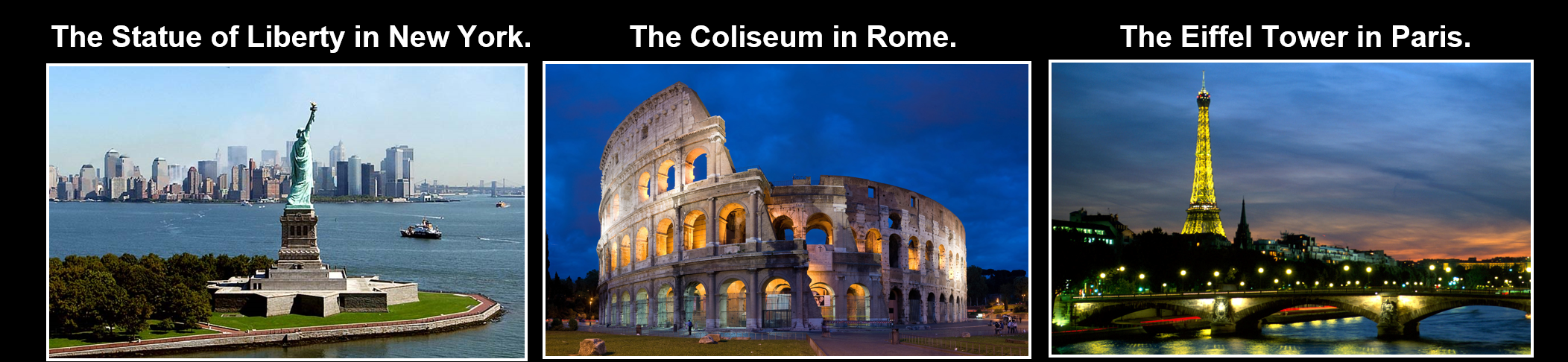 城市和国家也有自己的视觉锤。一些比较著名的画面会让我们想到一些城市。比如纽约的女神像、罗马的竞技场、巴黎的埃菲尔铁塔,还有悉尼的歌剧院、日本的银座、墨西哥的红场,以及中国的长城。
