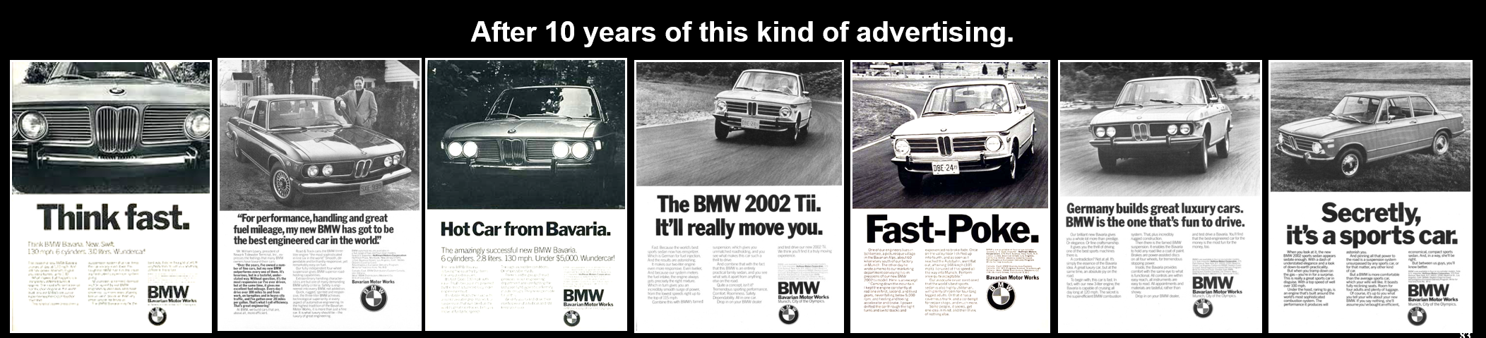 宝马曾经做过这样一个广告,广告词说他们什么样的功能都有,它是一个豪华汽车品牌,它的性能、操控、燃油性都非常好。宝马广告的效果怎么样呢?十年当中它做广告什么都涵盖,针对所有的消费者,但是并没有得到成功,它在美国市场的欧洲进口汽车品牌中位列第十一位。