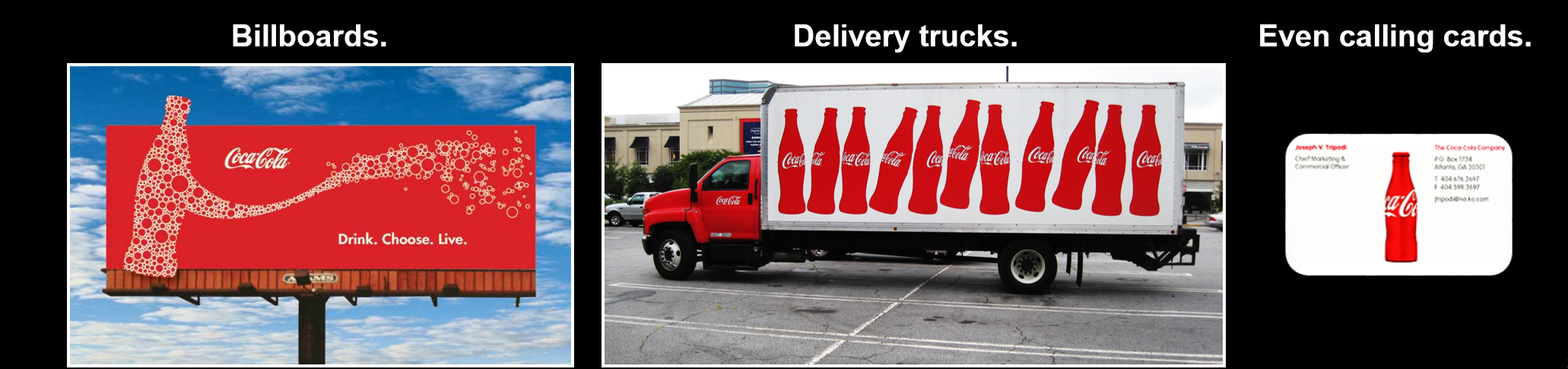今天,并不是所有可口可乐都装在这个瓶子里来销售,但是在所有的产品包装上,比如易拉罐,平面广告和户外广告上、送货车上、电话卡上,我们都能看到这样一个流线瓶的视觉锤。这就是可口可乐视觉锤的效果。