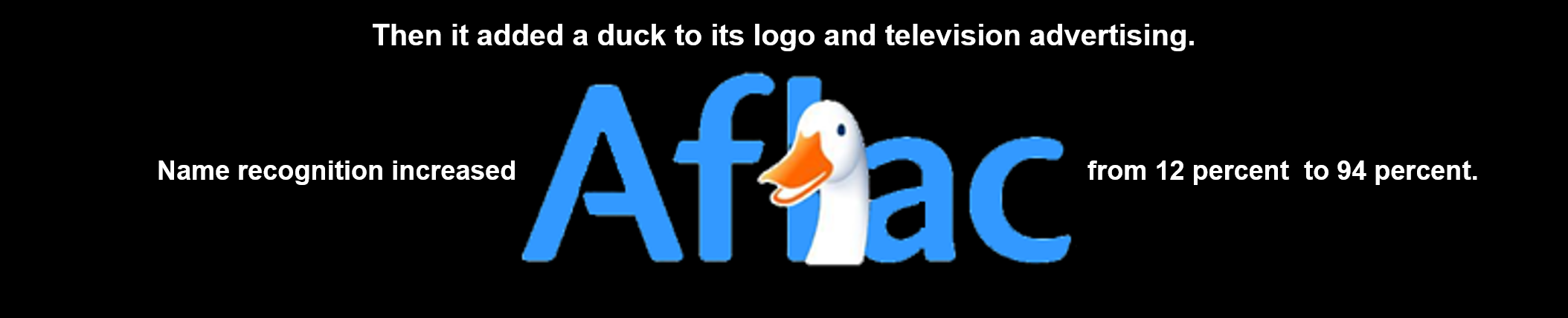 比如,Aflac当时的品牌知名度只有12%,后来把鸭子加在自己的logo上,在广告上也用了这样的视觉效果,它的知名度马上从12%提升到了94%,效果非常好。为什么Aflac选用鸭子的图像?鸭子的叫声很像aflac。通常来说,保险公司希望人们能记住自己的名字,让消费者主动来找保险公司。