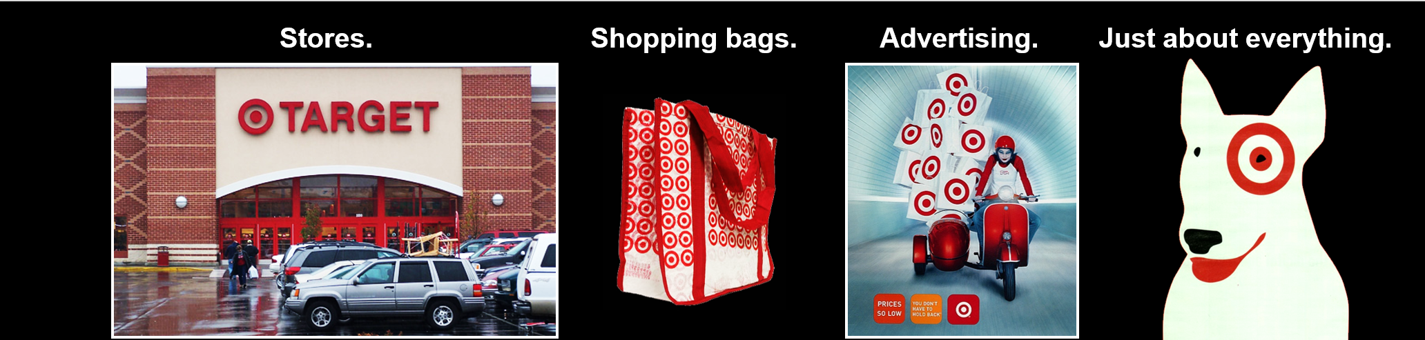 先从形状开始。塔吉特(Target)是美国很有名的零售商,就像沃尔玛一样,但它可能更时尚。塔吉特的视觉锤用在很多地方,比如店铺,购物袋,甚至品牌吉祥物狗的脸上。这样的视觉锤展示了塔吉特自己的形象和定位。它的吉祥物狗也很出名,它的故事时常登上纽约的报纸。这个视觉锤对它的品牌提升带来很大的效果,现在塔吉特的利润率已经超过了沃尔玛。去年沃尔玛的净利润率是2.8%,塔吉特是3.9%。
