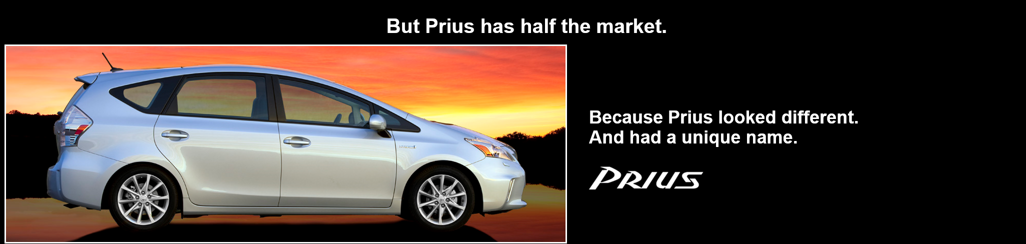 普锐斯(Prius)是丰田混合动力车型的一个新品牌,为什么普锐斯能够主导市场呢?它有一个新的品牌名,而且在视觉上看上去与众不同。它看上去跟别人不一样,甚至有点奇怪。