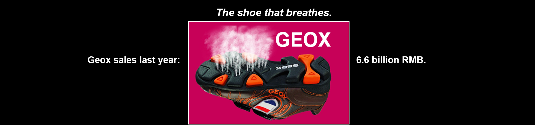Geox是意大利最好的鞋品牌。品牌的广告表达了这样一个意思:会呼吸的鞋。如果只是依靠语言去说,不如把视觉呈现给消费者。这样一个视觉呈现给消费者之后,表达了非常明确的意思。Geox去年的销售额非常高。