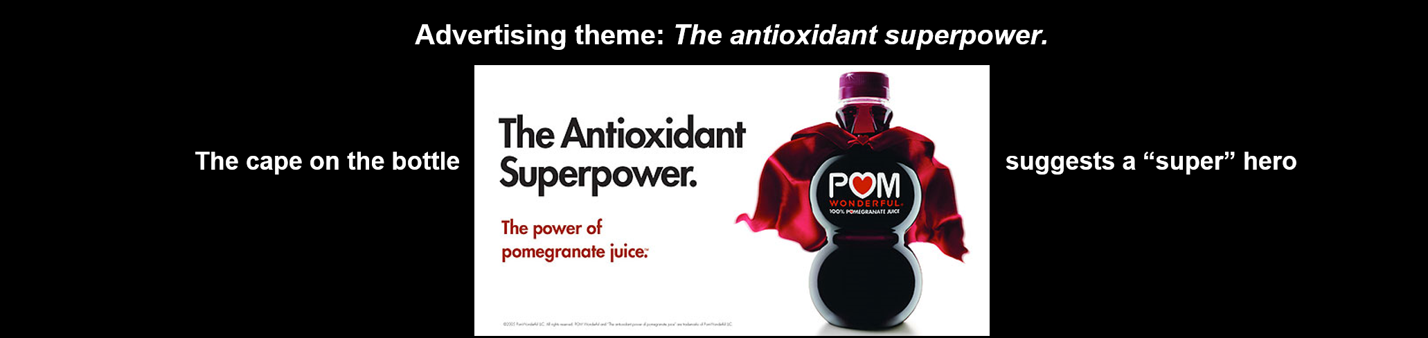 POM Wonderful这款石榴汁饮料是新品类中的第一个品牌,而且制造了非常好的公关,它的包装视觉锤极大地推动了公关。可以看到广告的主题是抗氧化超级饮料,它的产品包装上面还有一个披肩,表达一个超级英雄的概念。