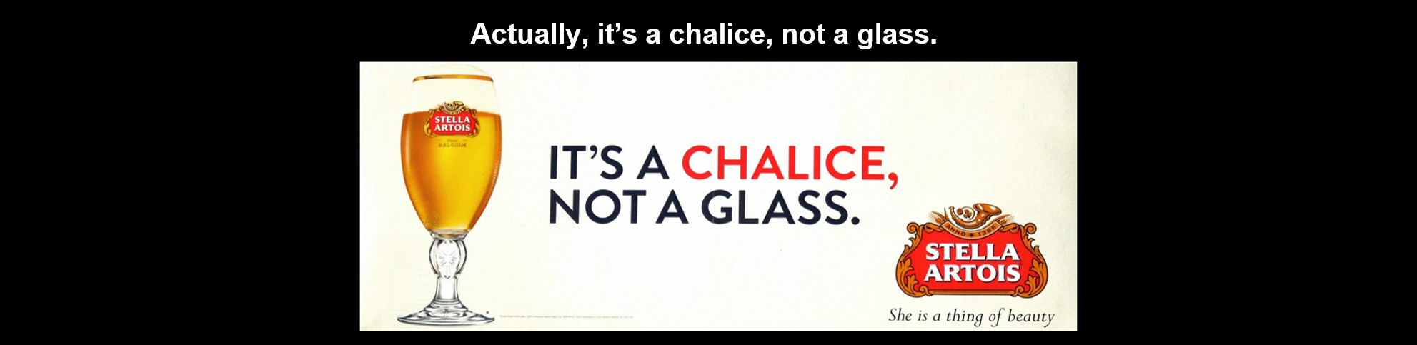再举一个例子,时代啤酒的视觉锤。我们通常都是用玻璃杯来喝啤酒,时代啤酒捆绑销售了独特的玻璃杯,它甚至在广告口号中也宣传它的杯子:它不是普通的玻璃杯,它是盛杯。在卖场中,时代啤酒的六瓶装销售就附带一个它的啤酒杯。