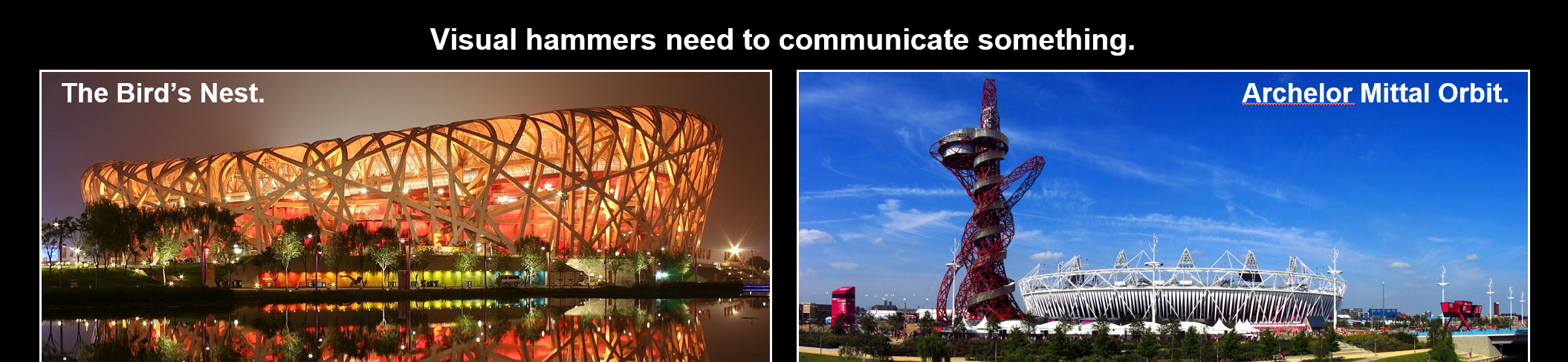 把2008年北京奥运会跟2012年伦敦奥运会做比较,北京有鸟巢,而伦敦的标志很难说清。哪一个文字的概念能够在心智当中创造出一个图像呢?一个有效的视觉锤需要能够传递具象的信息。