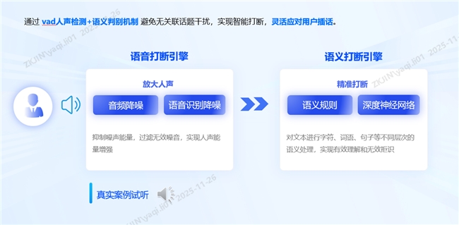 “接得住”,插话响应超灵敏,交互自然如真人:通过VAD人声检测与语义判别双引擎协同,智能体可在1.8秒内灵敏捕捉客户插话并即时响应,自动中断当前播报,优先解答疑问。这种“随时接话”的交互模式,模拟真人销售的沟通体验,大幅降低客户沟通障碍。