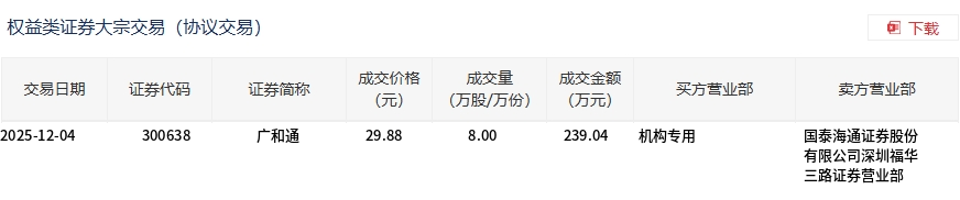 广和通今日大宗交易平价成交8万股,成交额239.04万元