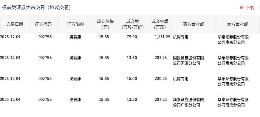 12月4日,奥赛康大宗交易成交117万股,成交额1795.96万元,占当日总成交额的13.31%,成交价15.35元,较市场收盘价17.03元折价9.86%。