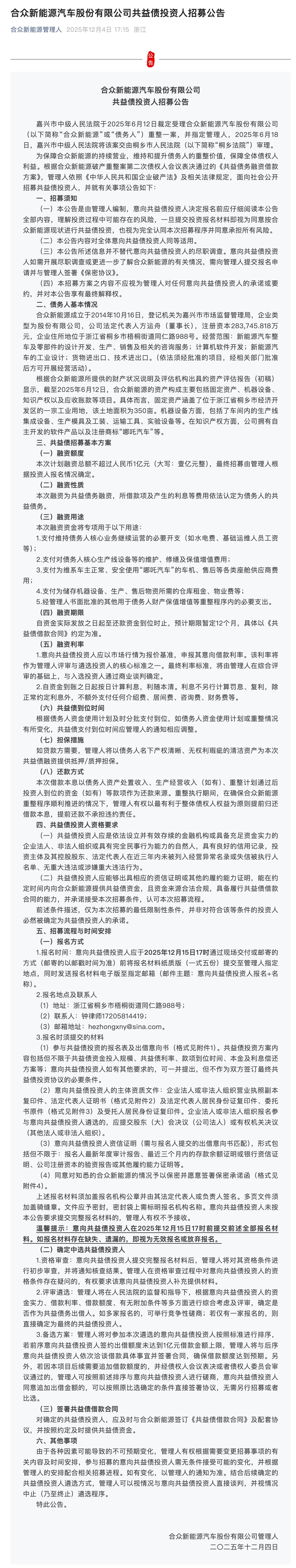 12月4日,合众新能源汽车股份有限公司(哪吒汽车实体公司)管理人发布共益债投资人招募公告,面向社会公开招募共益债投资人。根据招募公告,本次计划融资总额不超过人民币1亿元,最终招募由管理人根据投资人报名情况确定。本次融资为共益债务融资,所借款项及产生的利息等费用依法认定为债务人的共益债务。