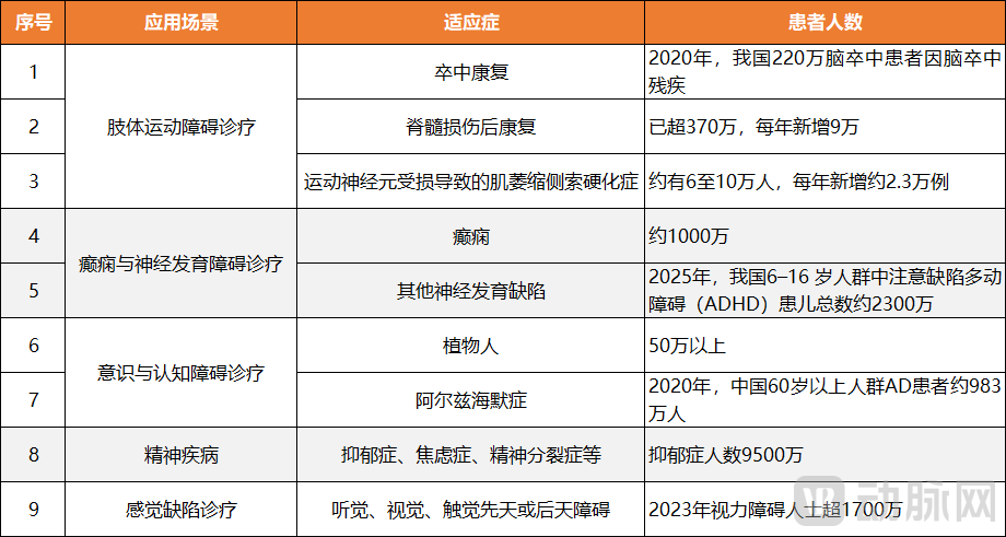 图5.脑机接口在医疗领域的主要适应症及患者人数