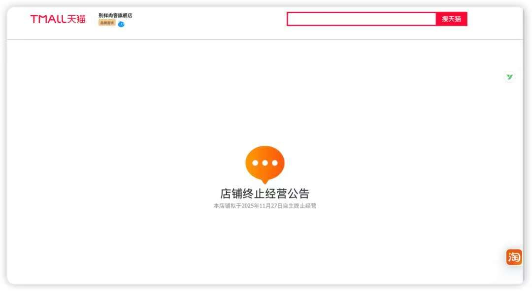 2025年11月27日,天猫“别样肉客官方旗舰店”首页弹出提示:“本店拟于2025年11月27日自主终止经营。”与此同时,拼多多旗舰店也无法正常显示,只剩下“服务器错误”。媒体尝试联系别样(嘉兴)食品有限公司,只听到冰冷提示:“您拨打的电话尚未登录。”