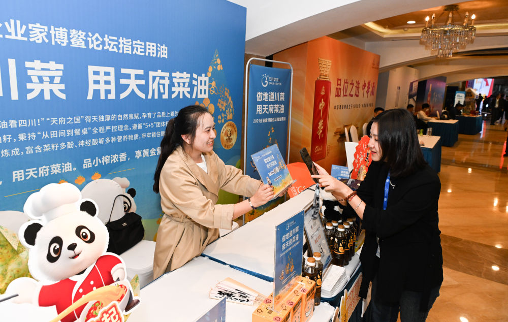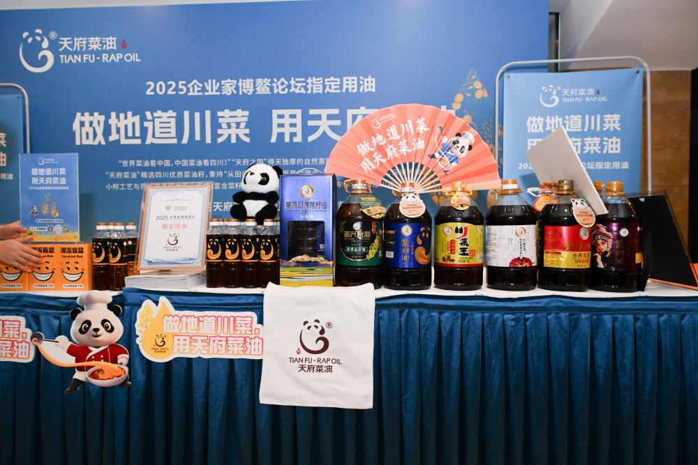 2025企业家博鳌论坛以“链接全球,引领未来:‘十五五’新机遇”为主题,包括世界500强、中国500强和行业领军企业家在内的各界嘉宾汇聚一堂,共话“十五五”发展新机遇,共探新发展格局下企业发展的新路径、新作为。“天府菜油”作为重要品牌代表,不仅融入主论坛等现场环节,更在会场专设展区,集中展示“天府菜油”系列菜油产品与文创产品,吸引众多与会嘉宾驻足交流、互动体验。