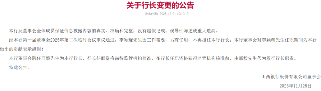 12月1日,该行公告显示,任职仅一年多的行长李颖耀卸任,拥有央行及外汇管理局背景的邢毅被聘任为新任行长。同时,首任董事长高计亮或因年龄原因退出董事会,首任行长任凯回归,或接任董事长一职。这意味着,山西银行的董事长与行长即将同步调整。