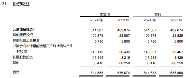 值得注意的是,近几年山西银行投资收益持续增长,2021-2024年分别为2.39亿元、6.19亿元、6.37亿元、8.45亿元。2024年该行“以摊余成本计量的金融资产终止确认产生的收益”增幅较为明显,由上一年的0.3亿元增至1.43亿元,此外,交易性金融资产、其他债权投资也有较大幅度增长。