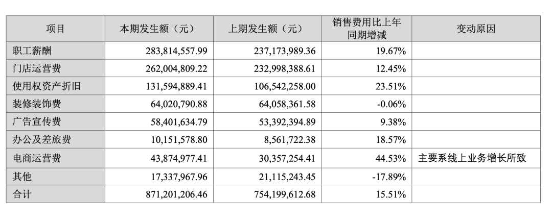 问题主要出在成本端。2025第三季度,销售费用从10.5亿增长到13.4亿。细节开销在半年报中集中呈现。半年报中,比音勒芬销售费用增长幅度同样超过一亿,其中职工薪酬增长超过4000万,门店运营费用提高近3000万;广告宣传费用增长近500万;电商运营费大涨超过1300万。而2024年,比音勒芬的广告宣传费、职工薪酬、门店运营费、装修装饰费,分别增加1亿元、6300万元、5300万元和3800万元。