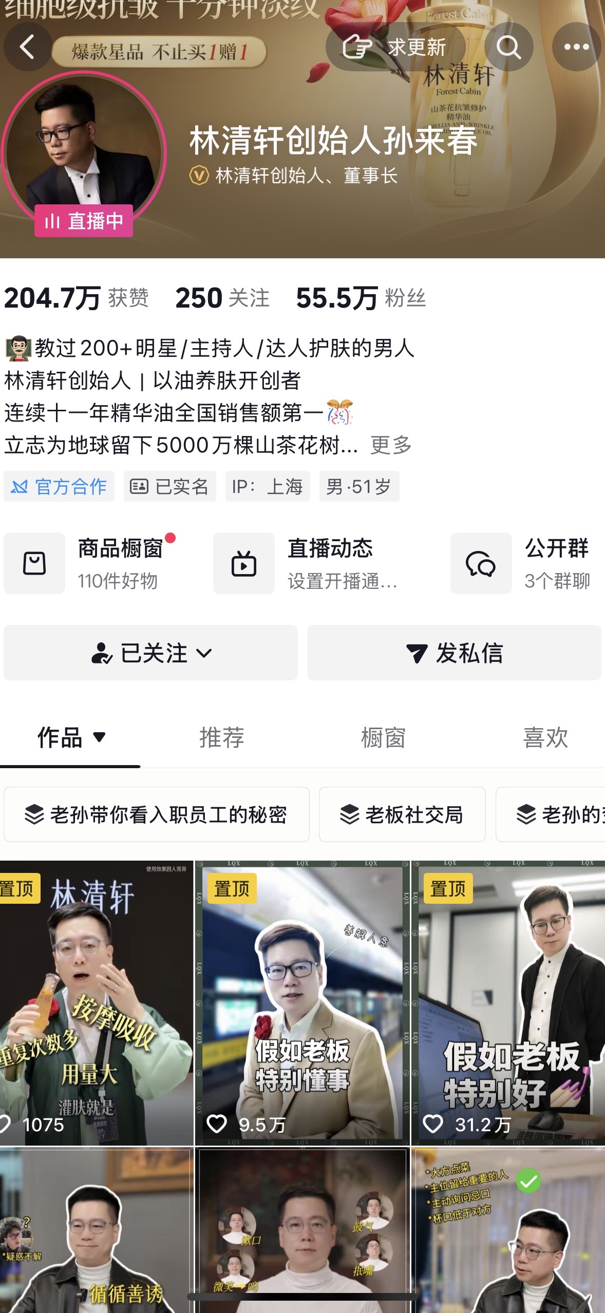 林清轩在各类线上内容平台的运营中,也呈现出高度依赖“人格化曝光”的特点。创始人孙来春、孙福春,以及家族成员孙福春儿子“小孙总”,乃至总裁助理、品牌合伙人,都在开设个人账号以塑造不同形象IP为品牌引流。在 CBE 美博会等行业展会上,界面时尚也曾多次看到孙来春亲自站在展位前直播卖货。