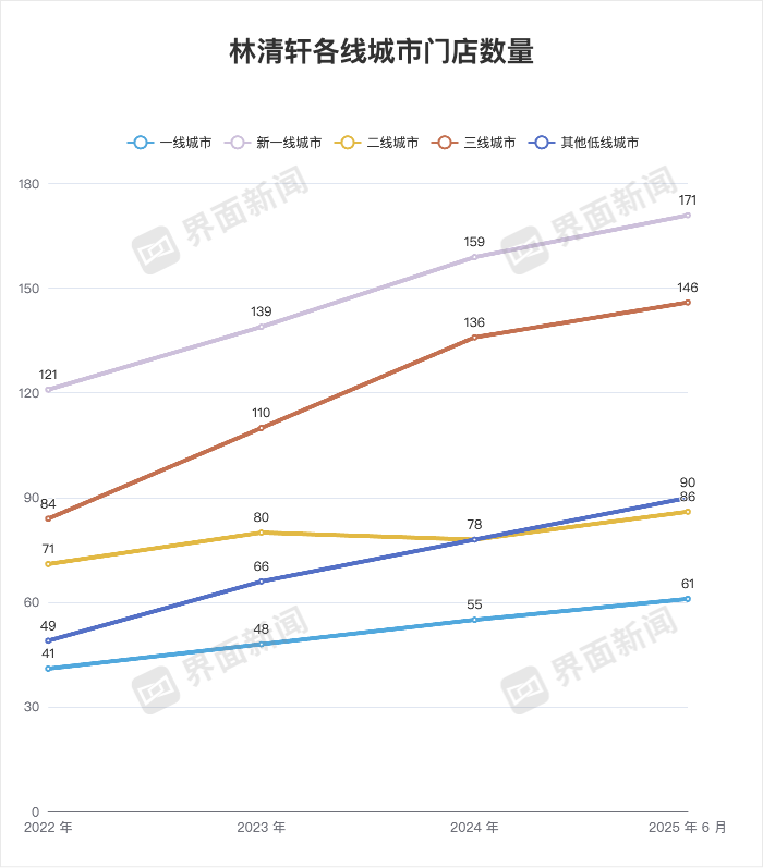 从门店城市分布来看,林清轩过去三年的线下扩张呈现出显著的从核心城市转向三线及以下市场的趋势。2022年至2025年上半年,一线城市门店从41家增至61家,三年新增 20 家,扩张幅度相对有限;新一线城市则从121家增至171家,保持稳步增长。