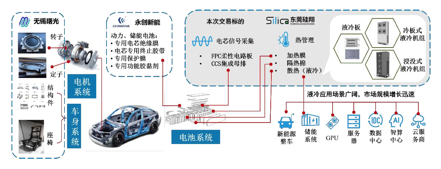 根据披露,东莞硅翔成立于2008年5月,主要产品包括CCS集成母排、FPC柔性电路板、加热膜、隔热棉等,并拓展了液冷板、液冷散热机组(CDU)、浸没式液冷机组等液冷产品线,液冷产品已于2024年开始实现收入。东莞硅翔的客户涵盖宁德时代、比亚迪、小鹏汽车、中国中车等。