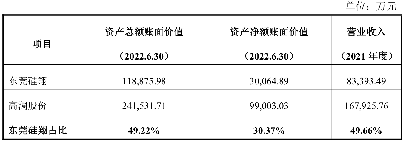 从历史情况看,东莞硅翔曾是高澜股份的重要资产。在被高澜股份转让前,东莞硅翔2021年及2022年上半年的资产总额分别占高澜股份的29.3%和49.22%,2021年东莞硅翔的营业收入更是达到高澜股份的49.66%。
