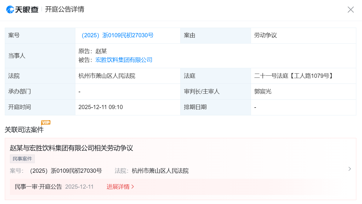 12月5日,天眼查官网显示,宏胜饮料集团有限公司新增一条开庭公告,宏胜饮料集团有限公司为被告,原告为赵某,案由为劳动争议。该案将于12月11日开庭。目前该案件处于民事一审。