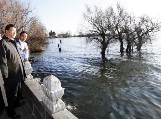 2015年1月,习近平来到大理白族自治州大理市湾桥镇古生村,仔细察看洱海边的生态保护湿地。 新华社记者 鞠鹏 摄