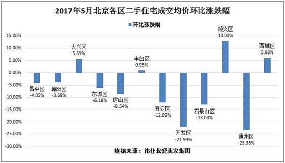 这几天,被“5月北京部分二手房跌价20%”的消息刷屏。该报道援引伟业我爱我家集团市场研究院统计称,2017年5月份,北京二手房成交均价环比4月份同期下滑2.4%。在有交易的12个区域中,多达8个区域的成交均价都在下跌,仅有4个区域的价格上涨。跌幅最大的是通州区、亦庄开发区,幅度都超过了20%。