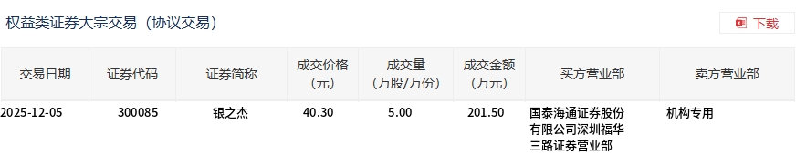 12月5日,银之杰大宗交易成交5万股,成交额201.5万元,占当日总成交额的0.08%,成交价40.3元,较市场收盘价40.3元持平。