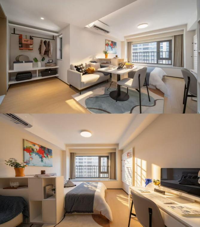 在规划设计阶段,公寓项目团队深入调研青年群体实际需求,注重功能性与实用性融合。针对独居青年、甜蜜情侣及年轻小家庭等不同客群需求,量身打造一房一厅及一居室等多元户型,实现居住空间的精准适配。在细节打磨上,更是尽显国企匠心:基于日常的生活习惯、使用便捷性,优化了房间内入口处的整体式玄关柜、部分户型的升降茶几、开放式次净衣更换区、沙发边几兼做床头柜、床底行李箱平推收纳区......LDK一体化餐客厨功能分区、躺平动线优化,洗手间干湿分离、270°宽幕视野,都是藏在产品研发里的懂得与看见。全屋采用环保建材与工艺,从源头杜绝装修污染,保障居住健康;推行宠物友好政策,兼顾养宠青年情感需求;配备智能门锁与小区式管理,筑牢安全防线。同时,公寓精心打造健身房、阅读区、共享会客区、游戏室、观影区等公共空间,既为青年提供了便捷的生活配套,更搭建起邻里互动的社交平台,让公寓从单纯的“居住场所”升级为都市青年成长与交流的重要载体。