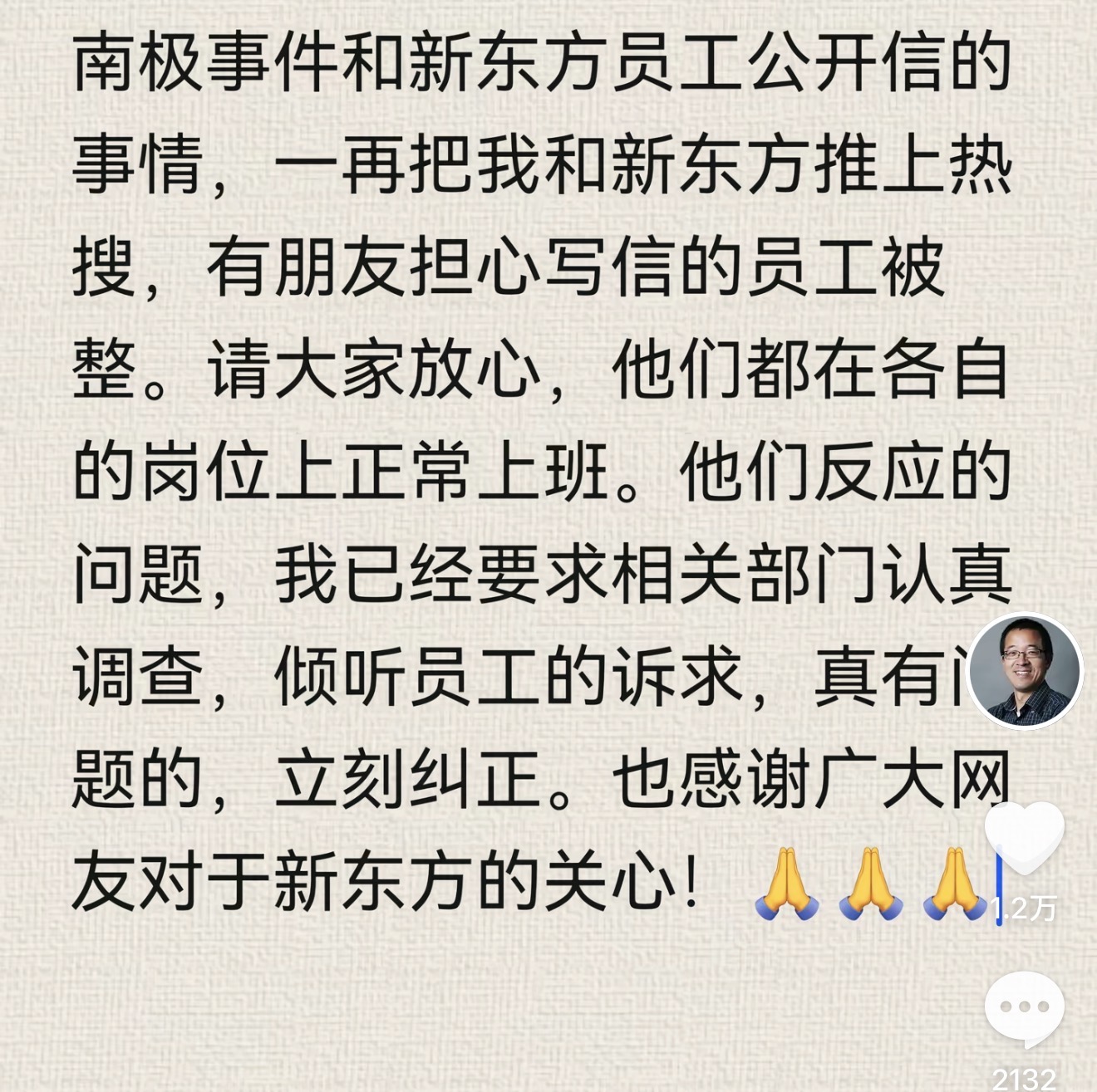 12月6日,新东方创始人俞敏洪在社交媒体发文,正式回应员工写信吐槽加班一事。俞敏洪表示,南极事件和新东方员工公开信的事情,一再把我和新东方推上热搜,有朋友担心写信的员工被整。请大家放心,他们都在各自的岗位上正常上班。他们反应的问题,我已经要求相关部门认真调查,倾听员工的诉求,真有问题的,立刻纠正。