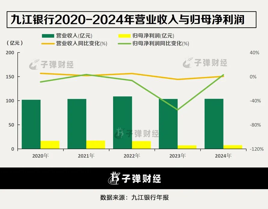 「子弹财经」翻阅九江银行过去五年的经营数据(即2020年至2024年),发现其归母净利润分别为16.73亿元、17.29亿元、16.15亿元、7.24亿元和7.44亿元,呈现出较为鲜明的回落趋势。尤其是2023年净利腰斩,降幅为55.2%。