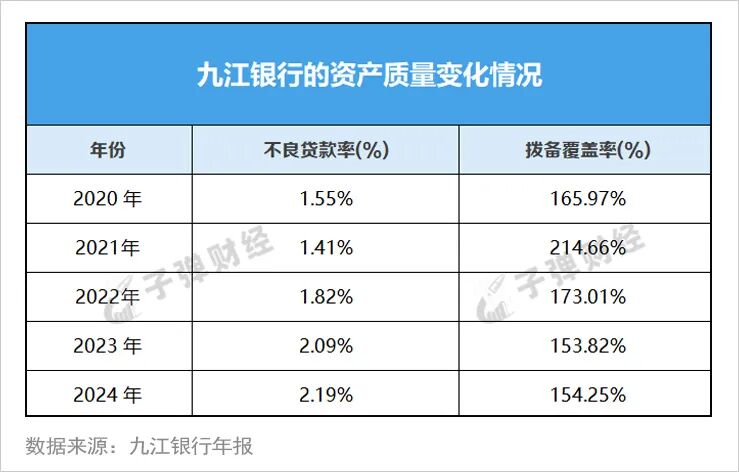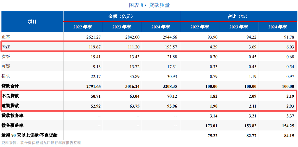 联合资信发布的九江银行2025年评级报告指出,该行2024年不良贷款率有所上升,关注类贷款占比较高,拨备面临一定计提压力,房地产行业的风险敞口仍较大。
