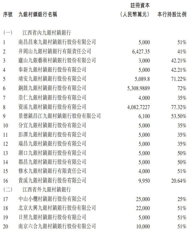 图 / 九江银行旗下20家村镇银行名单(来源:九江银行公告)